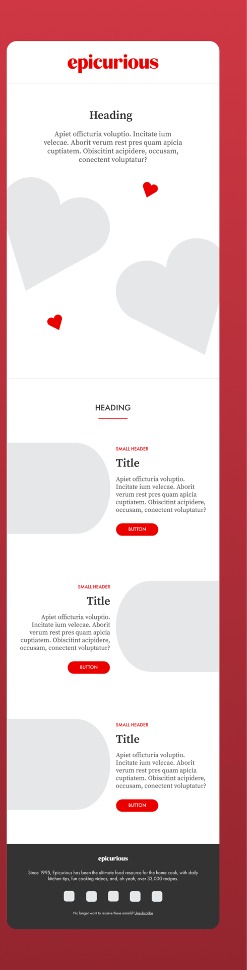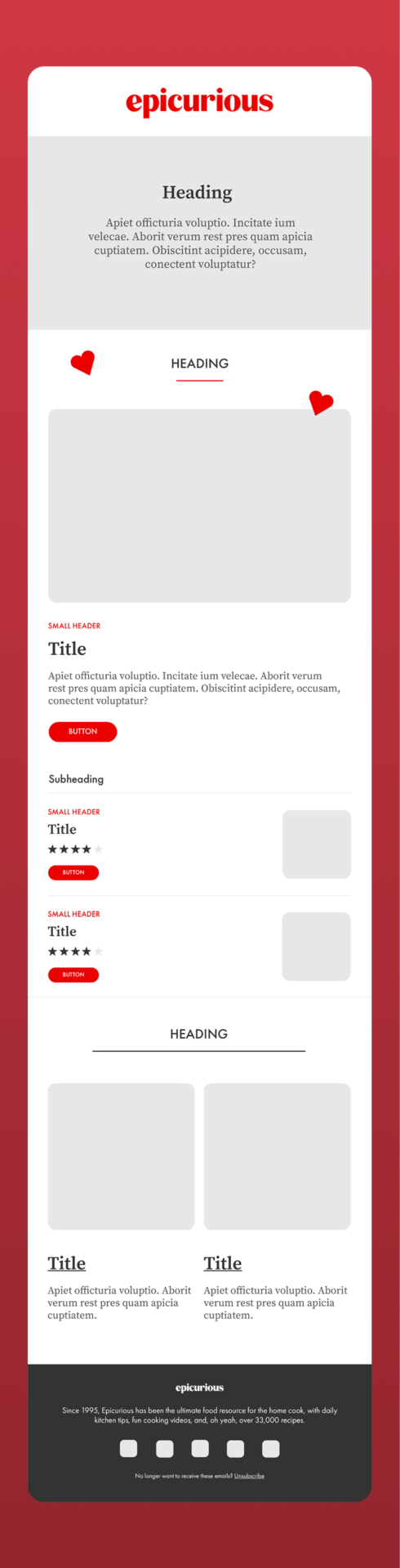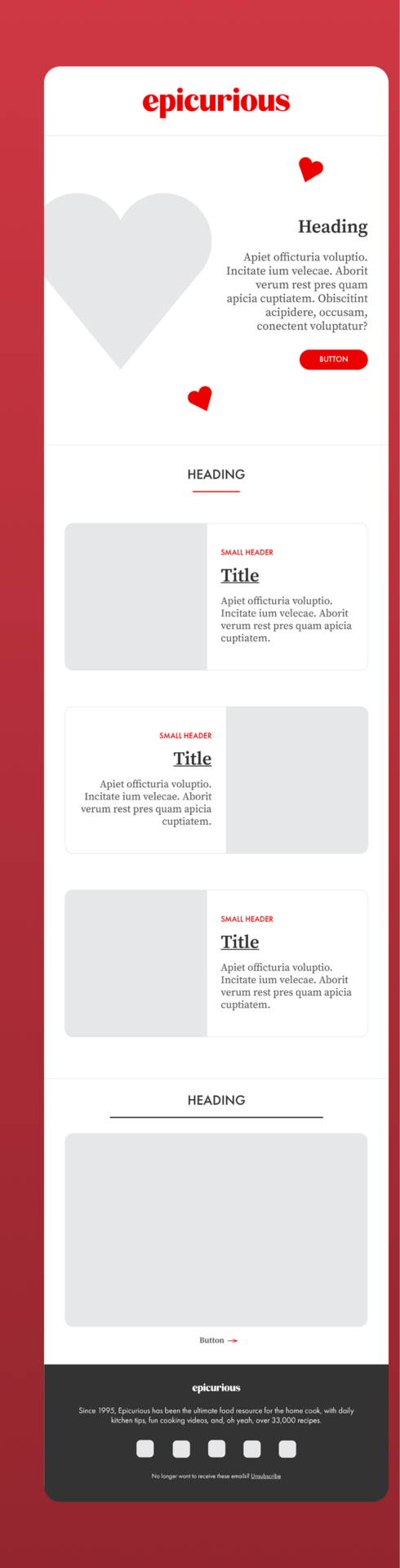 For this project, I designed a Valentine’s Day email newsletter featuring curated recipes, drinks, and desserts. The goal was to capture Epicurious’ warm, modern aesthetic while creating a festive, easy-to-skim layout that highlights seasonal dishes and drives engagement.